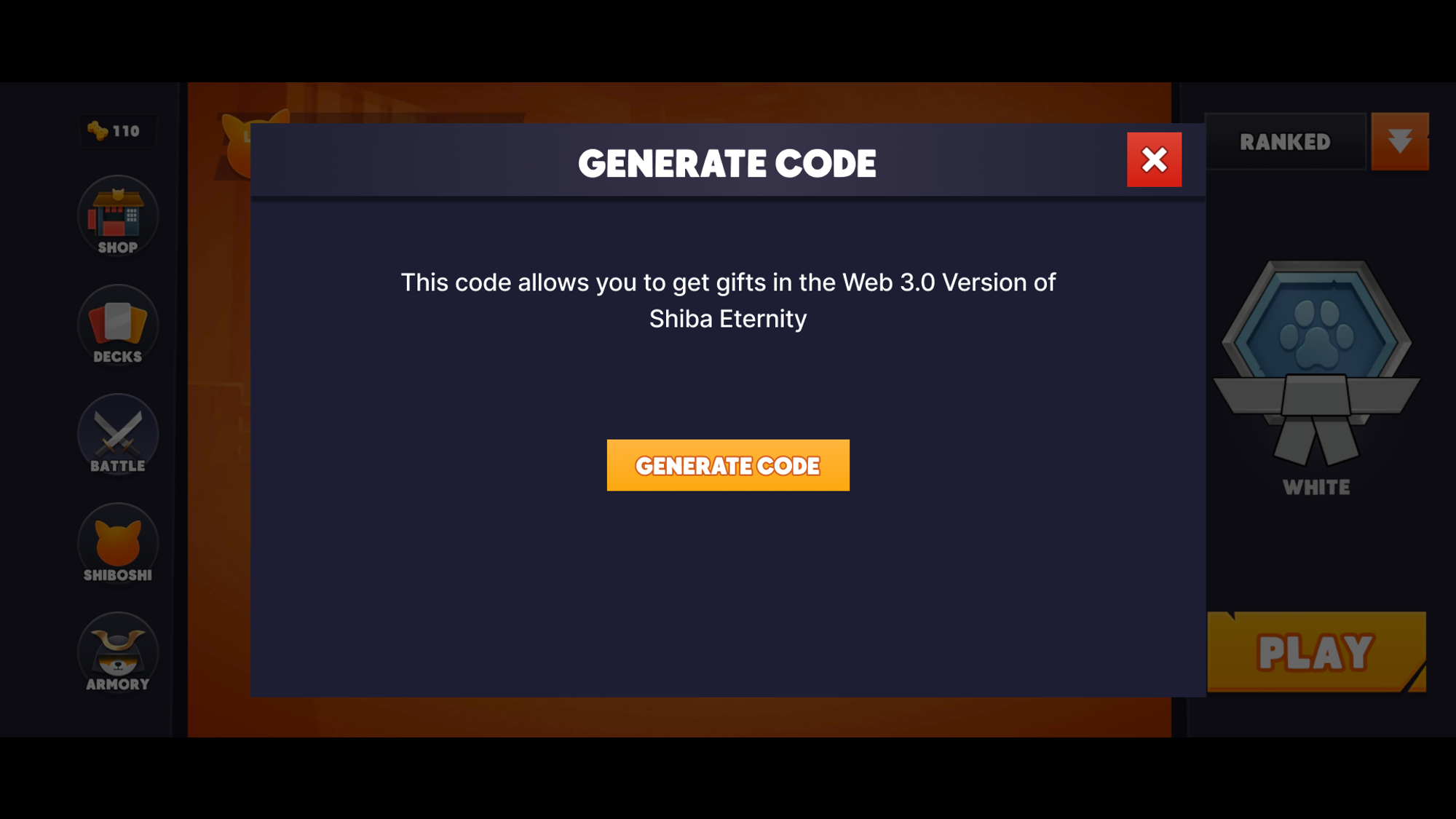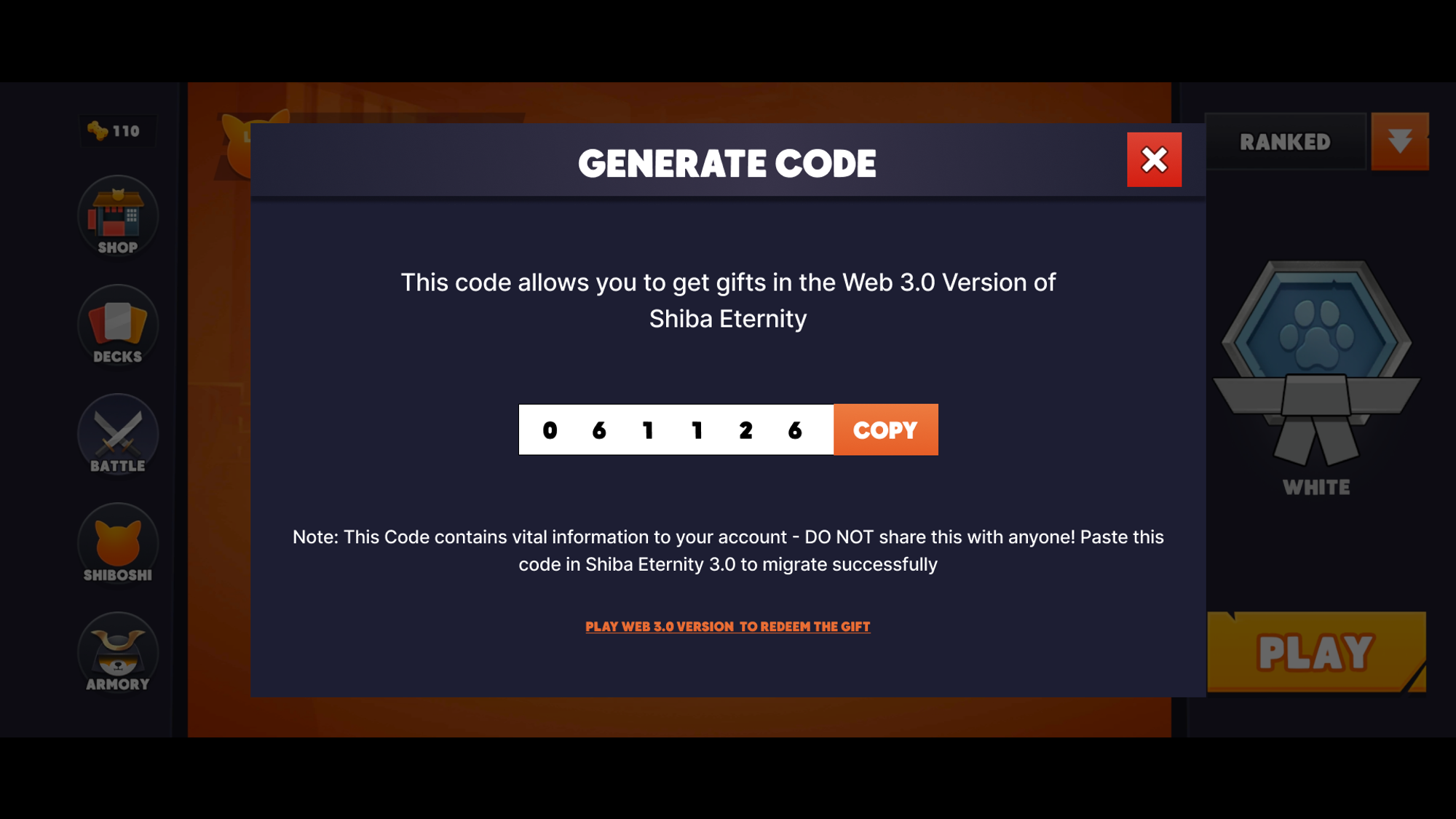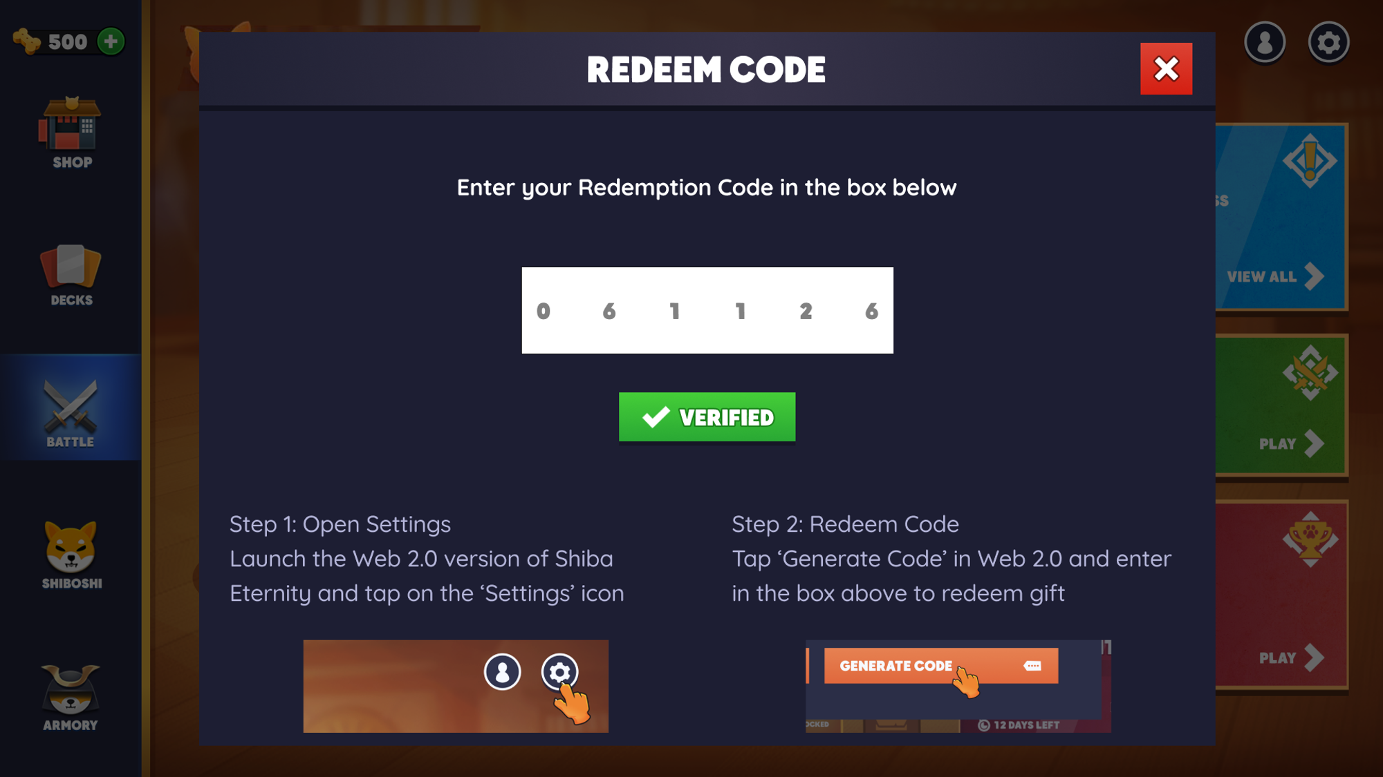 Next, log into your new game (web3.0) and head over to the Settings page again. There you will see a tab to Redeem Code. Just enter your code by taping on it and you will receive your welcome gifts!