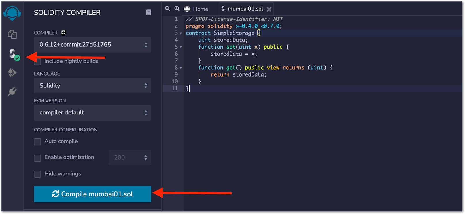 Click on the Solidity logo from the left menu and click on Compile. After successful compilation, a green tick will appear on the Solidity logo.