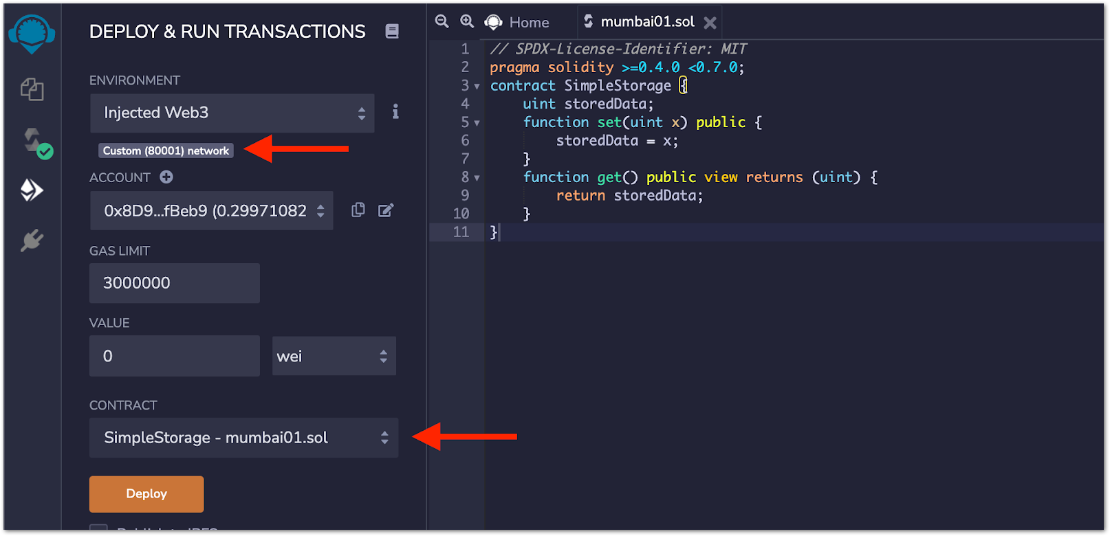 Now, click on the option from the left menu to deploy the complied contract and select Injected Web3 as the environment. Below the environment field, the name and Chain ID of your network will appear. Make sure you have the correct contract name selected under the contract option. Once you have checked everything, click on Deploy and accept the transaction from the MetaMask pop-up window.