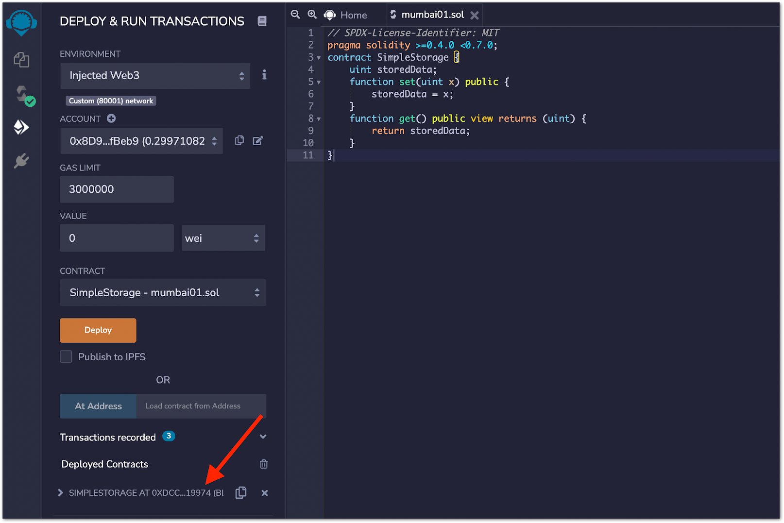 Once the contract deployment transaction is approved, the deployed contract will appear under the Deployed Contracts section.