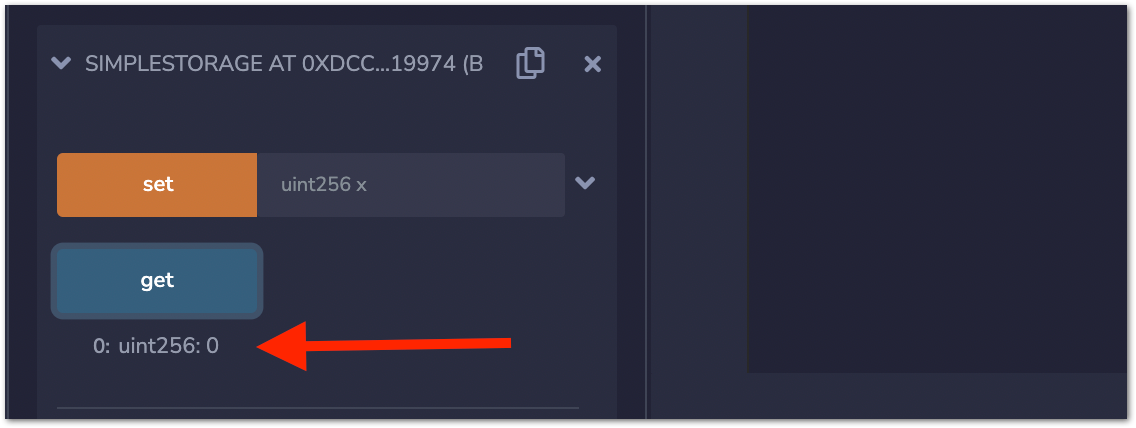 Expand the deployed contract and click on get. It will return the value of storedData, which is currently zero since you have not input any number yet.