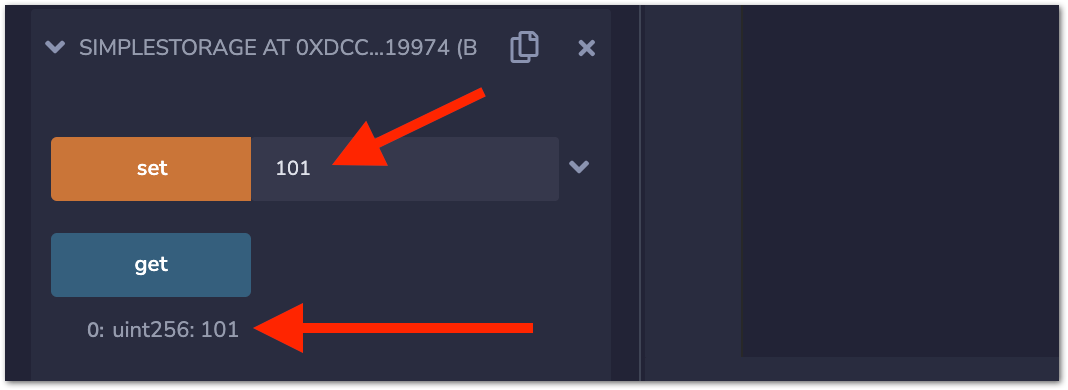 getfunction to retrieve the value ofstoreDatavariable. This function is marked as view, which tells the Solidity compiler that this is a read-only function. Other than that, thegetfunction also has returns (uint), which means that the function will return a uint value.
