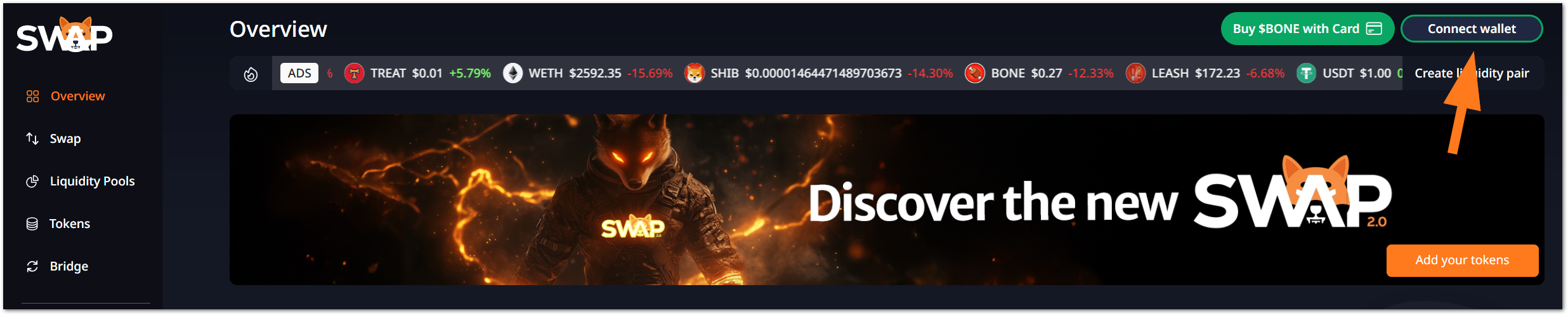 - As we stated before, to add a new token to ShibaSwap, you need to create a new trading pool. You can either utilize one of the available tokens to create a new pair or add 2 new tokens to create a completely new pair. In this example, we are pairing a test custom token with Shiba Inu BONE, leveraging Shibarium testnet, Puppynet. To do that, choose BONE for one of the tokens and click on Select Token for the custom one.
