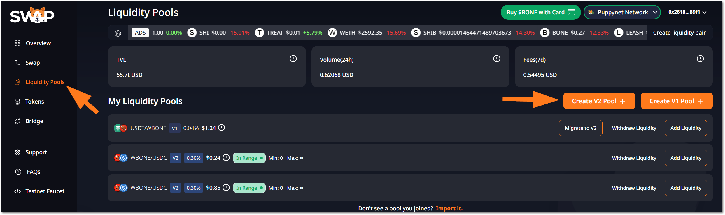 - Go to Liquidity Pools on the left menu and find the Create V2 Pool button on your right.