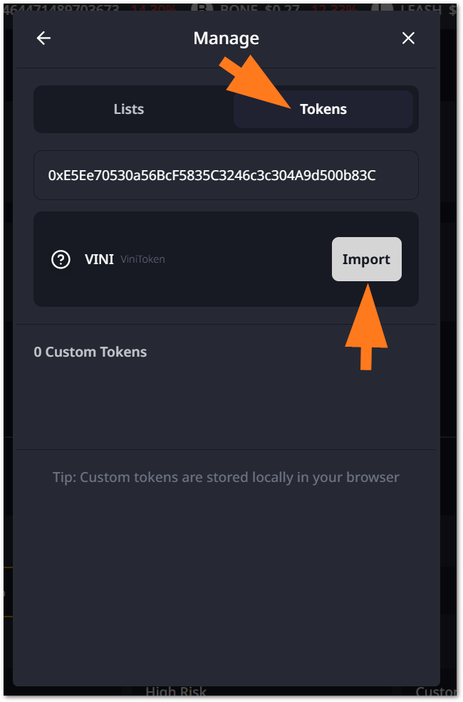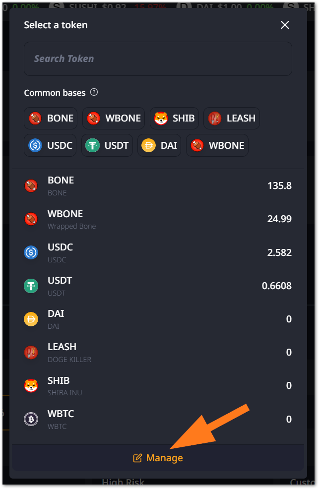 - You will see a list of available tokens with which you can create a new pair with BONE. However, in this tutorial, we would like to add a new custom token, so click on Manage. The Manage section gives you 2 options: acquire a token list from another provider, CoinGecko, for instance, or add specific tokens. Click on Tokens, paste the new token address and import it.