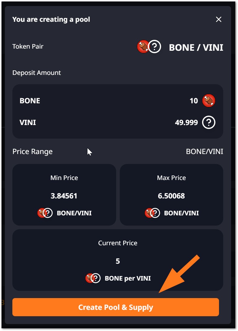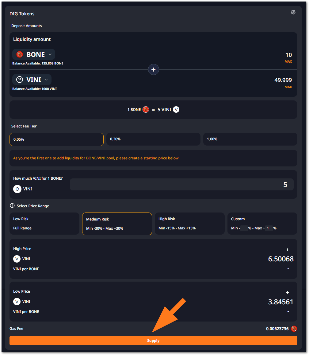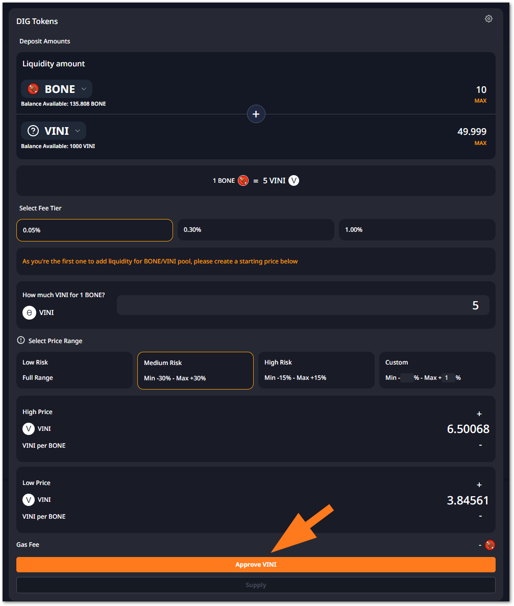 - You can choose now all the Pool parameters, which include adding a starting price, selecting a price range and adjusting it according to its risk level. When those settings are completed, click on Approve