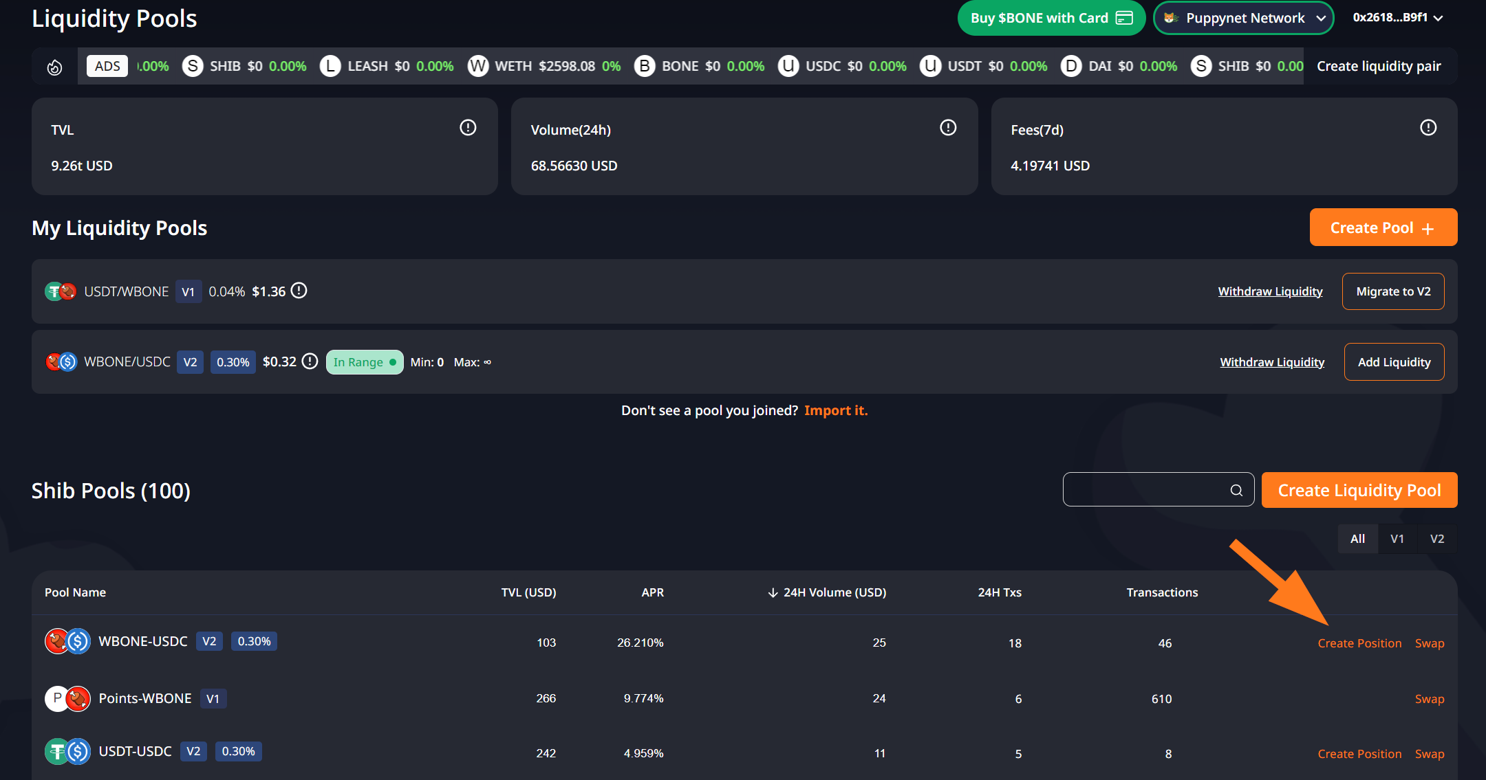 - Go to ShibaSwap and choose the pair you want to provide liquidity to. In our case, we’re using USDT-WBONE pool. Don’t forget to connect your wallet. If you haven’t yet, you will be prompted to do so.