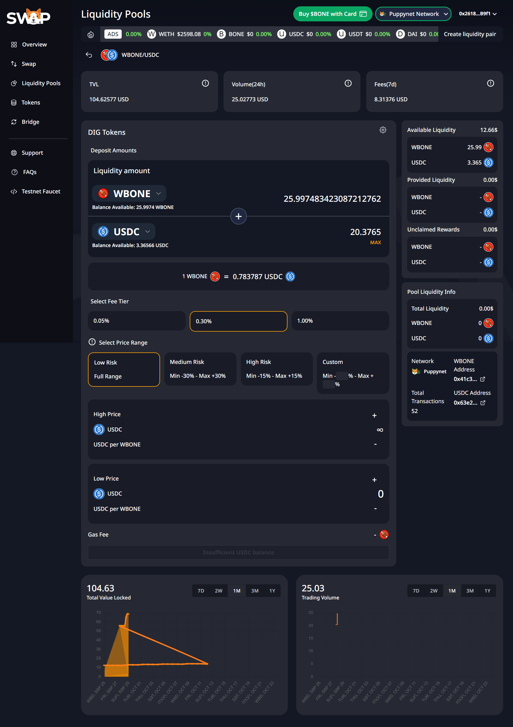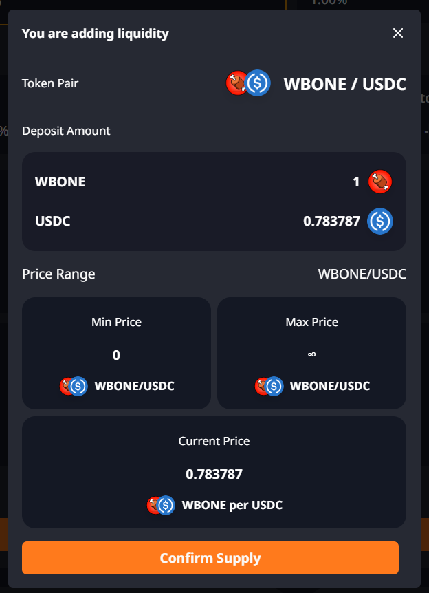 - After clicking on Create Position, you will be redirected to the pair page. There you can set the amount of tokens you wish to provide, check statistics for the pair, select fee tier and price range.