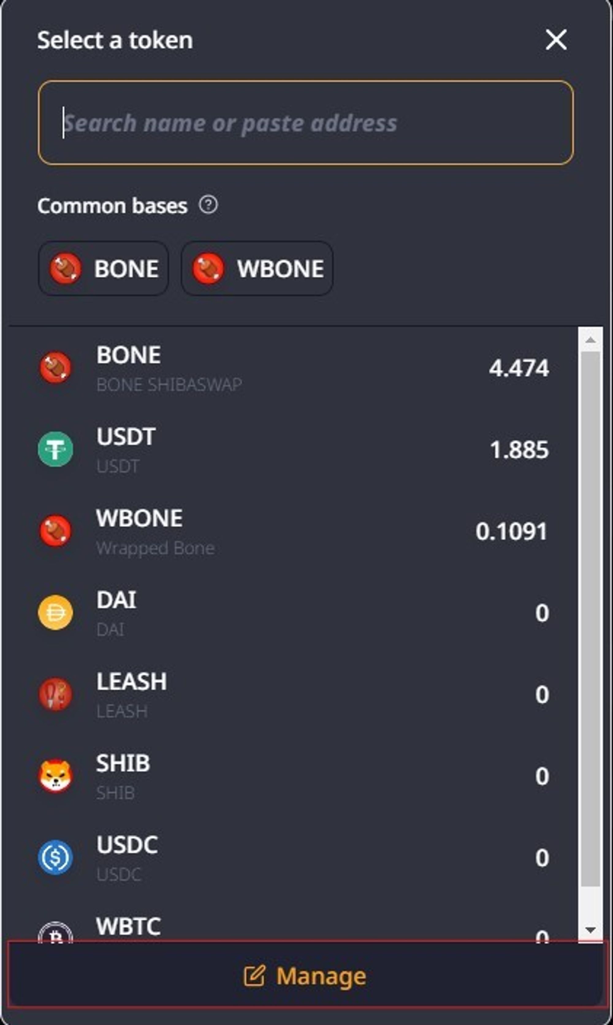 - You will see the list of available tokens. In our case, we will add a new token that is not available yet. Click on Manage at the bottom of the module.