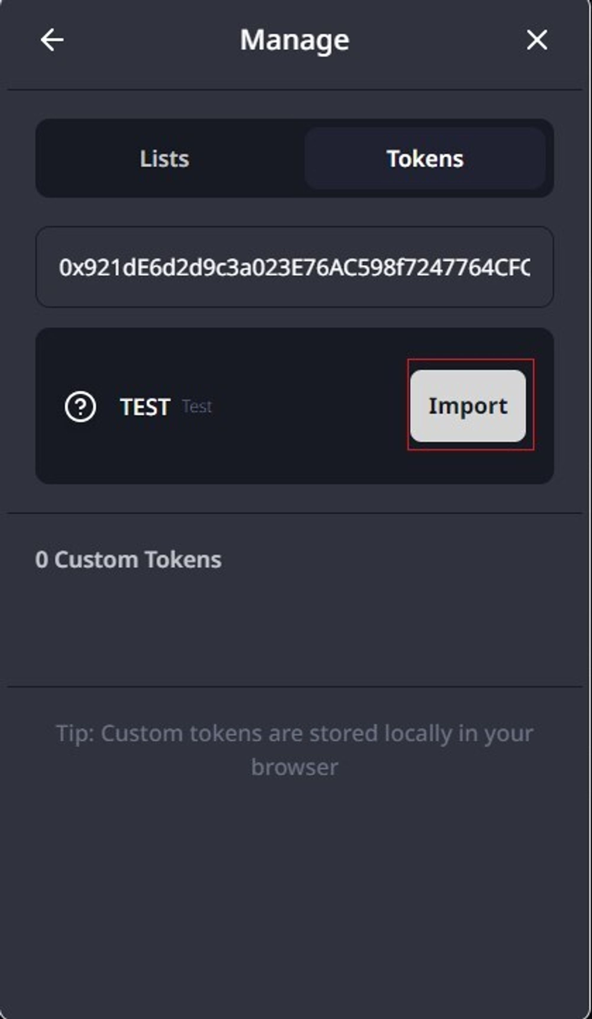 - Make sure the Tokens tab is selected. If so, paste the token address and Import the token.