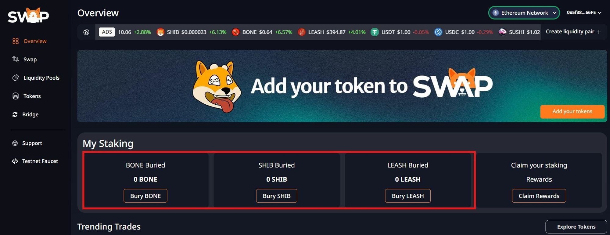 - Click on Bury SHIB/BONE/LEASH on the overview page on ShibaSwap.