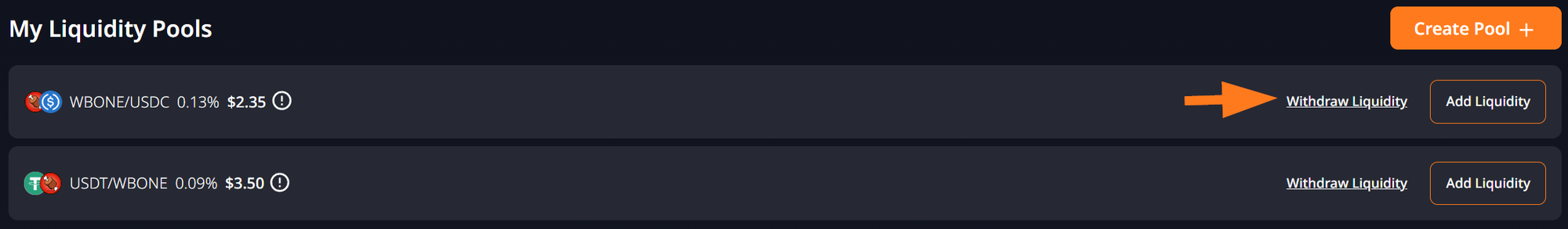 - On the Liquidity Pools page, you can see a list of liquidity pools you have contributed to. Click on Withdraw Liquidity to proceed.