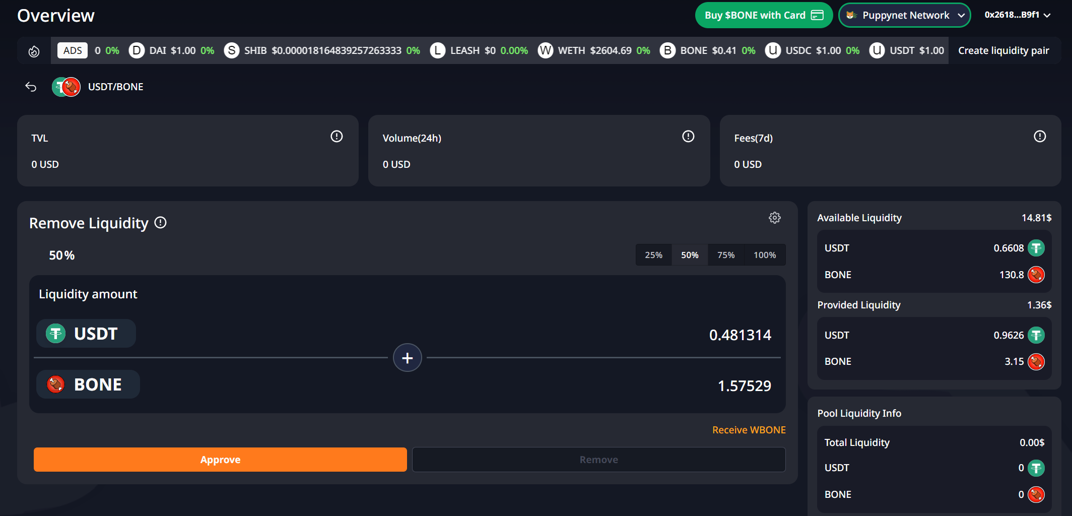 - You can use the percentage buttons to choose how much of the two tokens you would like to get back. In this example, we’re withdrawing 50% of what we had previously invested. Click on Approve and follow the instructions from your wallet.